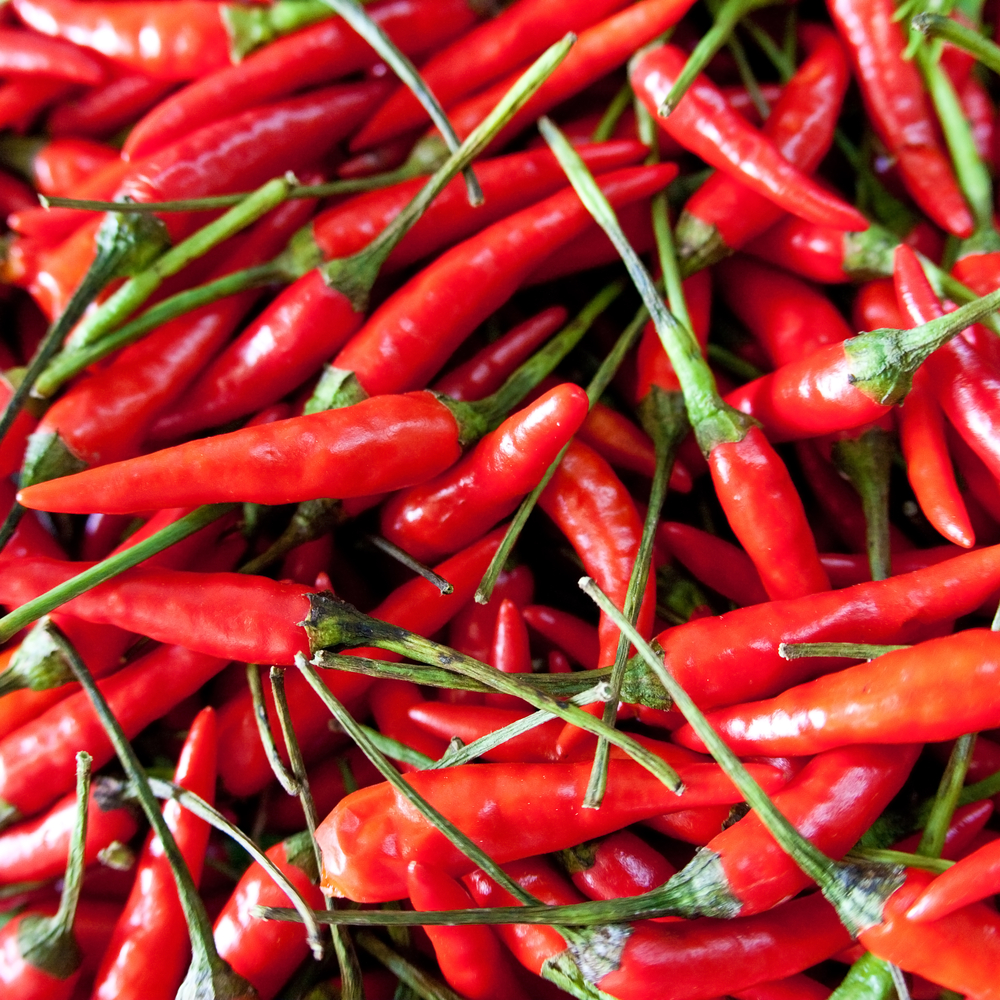 Bird's Eye Chili wächst an kleinen Sträuchern und hat kleine, längliche Früchte, die normalerweise zwischen 1 und 2 Zentimetern lang sind. Die Farbe der Früchte kann von grün bis rot reichen, je nach Reifegrad. Die Schärfe der Chilis variiert, aber sie werden normalerweise als sehr scharf bis extrem scharf eingestuft.