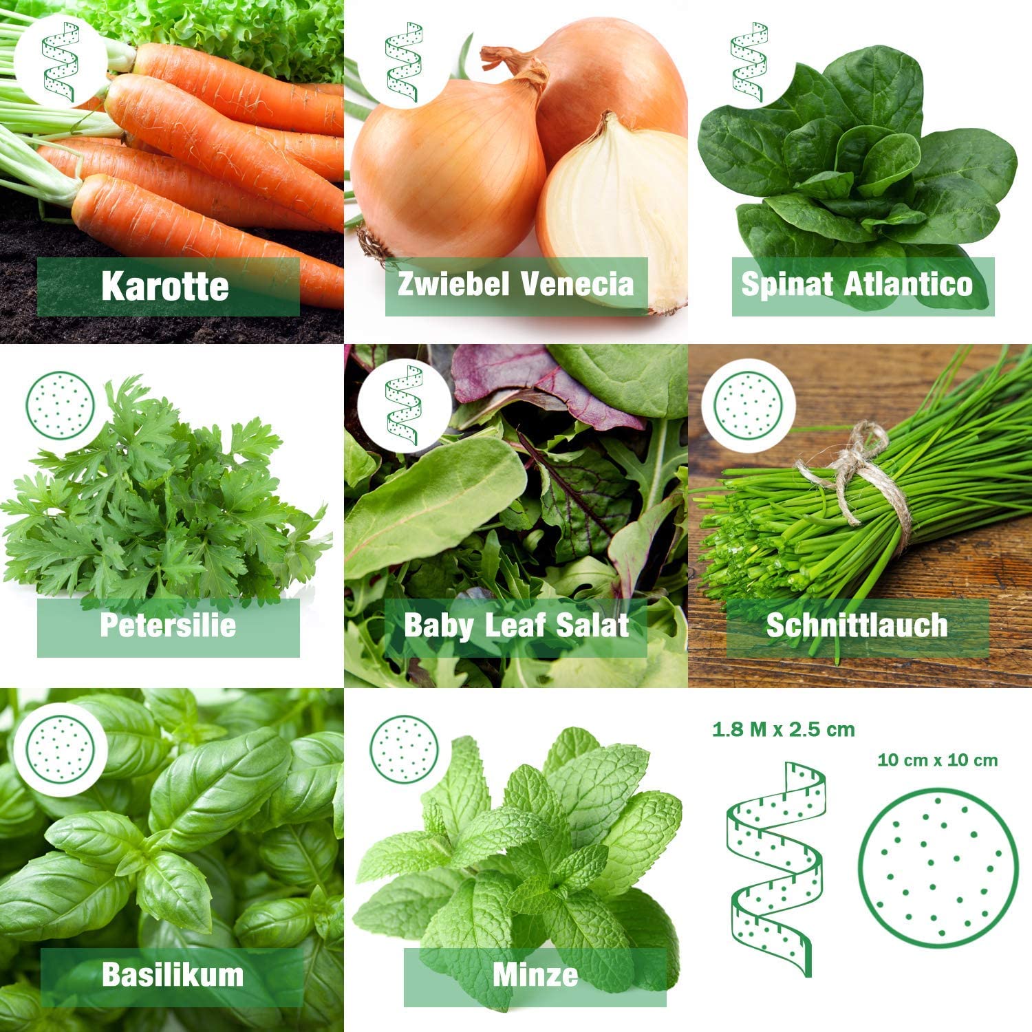 Lieferumfang: Gemüse Samen als Saatband: Karotten Samen, Salat Samen, Zwiebel Samen, Möhren Samen, Spinat Samen. | Als Pflanzscheibe: Basilikum Samen, Minze Samen, Petersilie Samen Kräuter, Schnittlauch Samen.